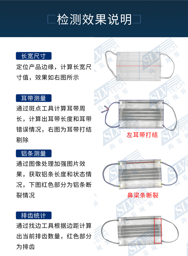 平面口罩檢測(cè)機(jī),為檢測(cè)平面口罩的各種不良而定制,大致的檢測(cè)項(xiàng)目包括: